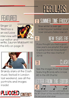 Within this contents page I took a less conventional approach and used a notebook style. This was initially to attract the eye to the page straight away. Having a strong contents page will prepare the audience for a good magazine throughout. I chose a cork background because its like a notebook style, its sketchy yet fun which is what my music magazine would be if I published it. The banner of images at the bottom of the page is unconventional yet I enjoyed putting this together because the images are controversial to the front cover image. This is because the front image is quite serious, a model-esk image. This strip of images shows a more fun, creative side of Lil'Red herself. This makes the audience want to read more about her DPS.